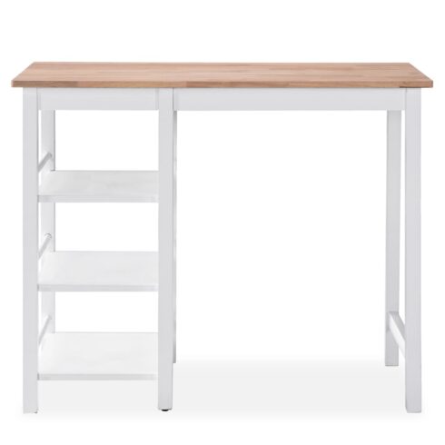 Komplektas yra pagamintas iš medienos plokštės (MDF) ir tvirto kaučiukmedžio. Kieta, šlifuota kaučiukmedžio mediena sudaro baltai dažytų rėmų pagrindą, o sėdynėms ir stalui atlikta aliejinė apdaila, išryškina ryškią ir šiltą medienos spalvą. Spalvų kontrastas papildo paprastą, bet stilingą išvaizdą. Dideliame baro stale yra trys lentynos vienoje pusėje, ant kurių galite laikyti virtuvės reikmenis ar kitus kasdienius daiktus, kuriuos norite išlaikyti lengvai pasiekiamus ranka. Taip pat šio baro kėdės turi dideles, ergonomiškas sėdynes.