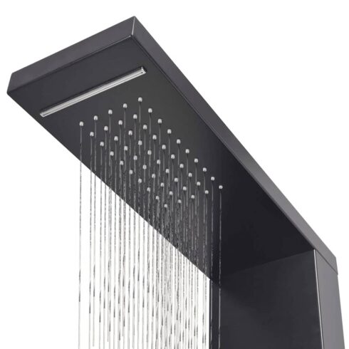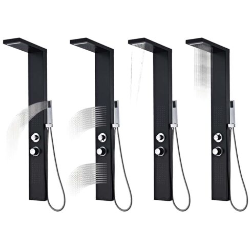 Dušo sistemos skydelis pagamintas iš patvaraus aliuminio, šlifuotos apdailos ir gražaus kvadratinio dizaino. Jis turi keturias funkcijas: lietus, krioklys, masažo purkštukai ir rankinis dušas, kurias lengvai galima pasirinkti mygtuku.