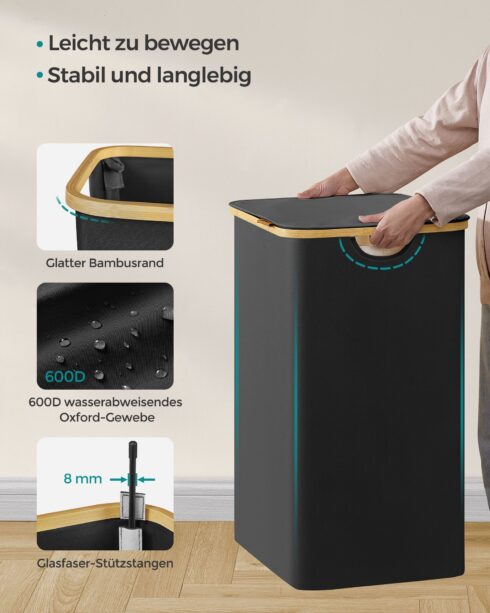 Būkite pirmas aprašęs “Skalbinių krepšys 3 skyriai su bambuko rankenomis rašalas juodas”