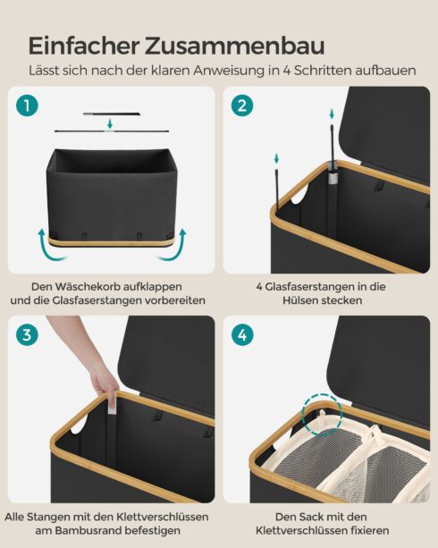 Skalbinių krepšys su 3 skyriais ir bambuko rankenomis rašalo juodos spalvos