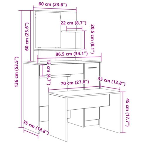 • Kosmetinio staliuko matmenys: 86,5 x 35 x 136 cm (plotis x gylis x aukštis)
